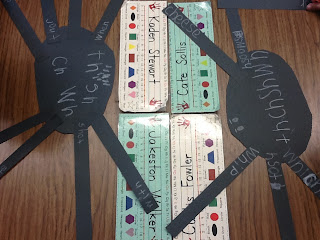 We have been working on learning some digraphs. A digraph is a combination of two letters representing one sound, as in ph and ey. The digraph's we have learned about so far are th, sh, ch, wh. We sing a song to the tune of BINGO- It goes like this: